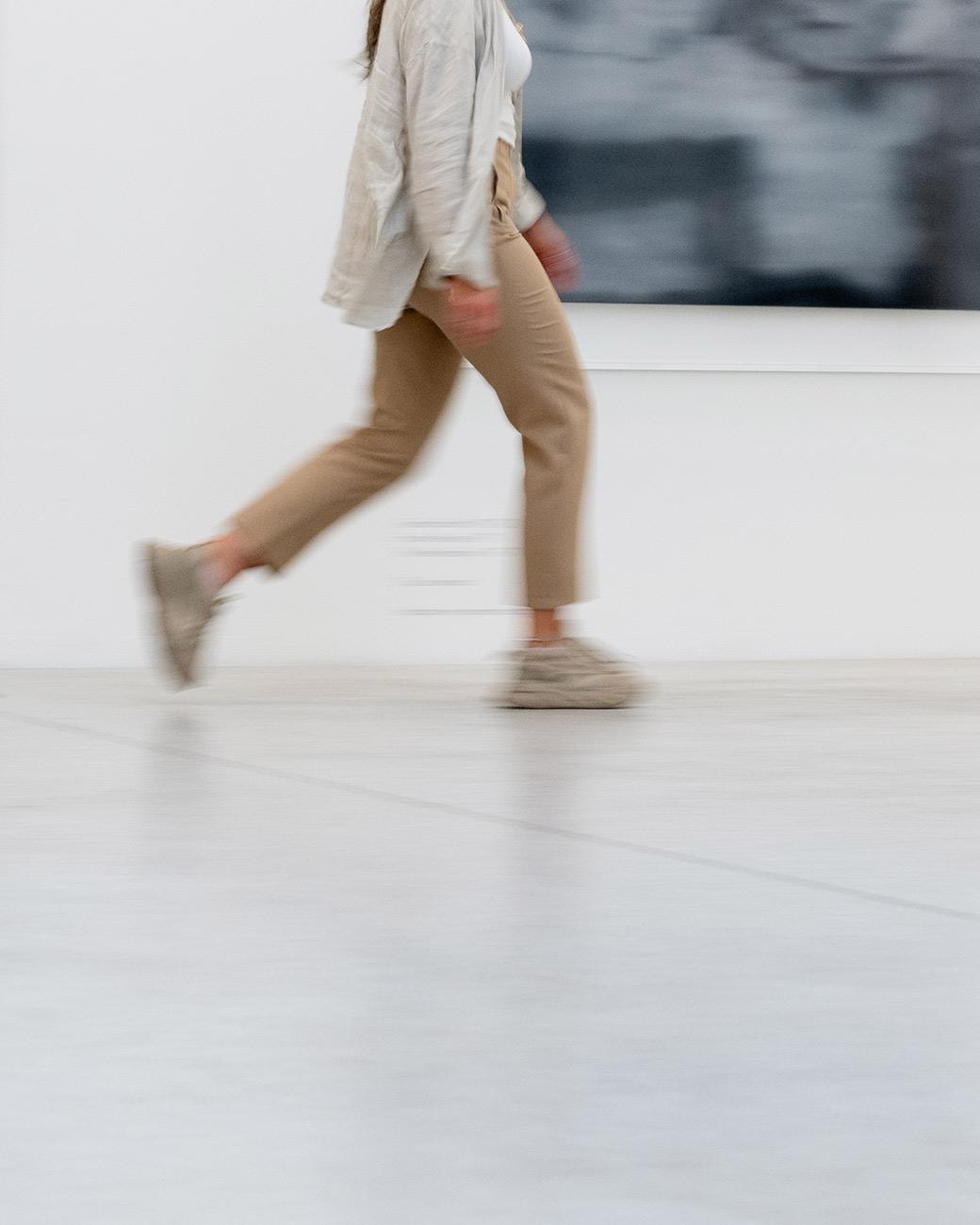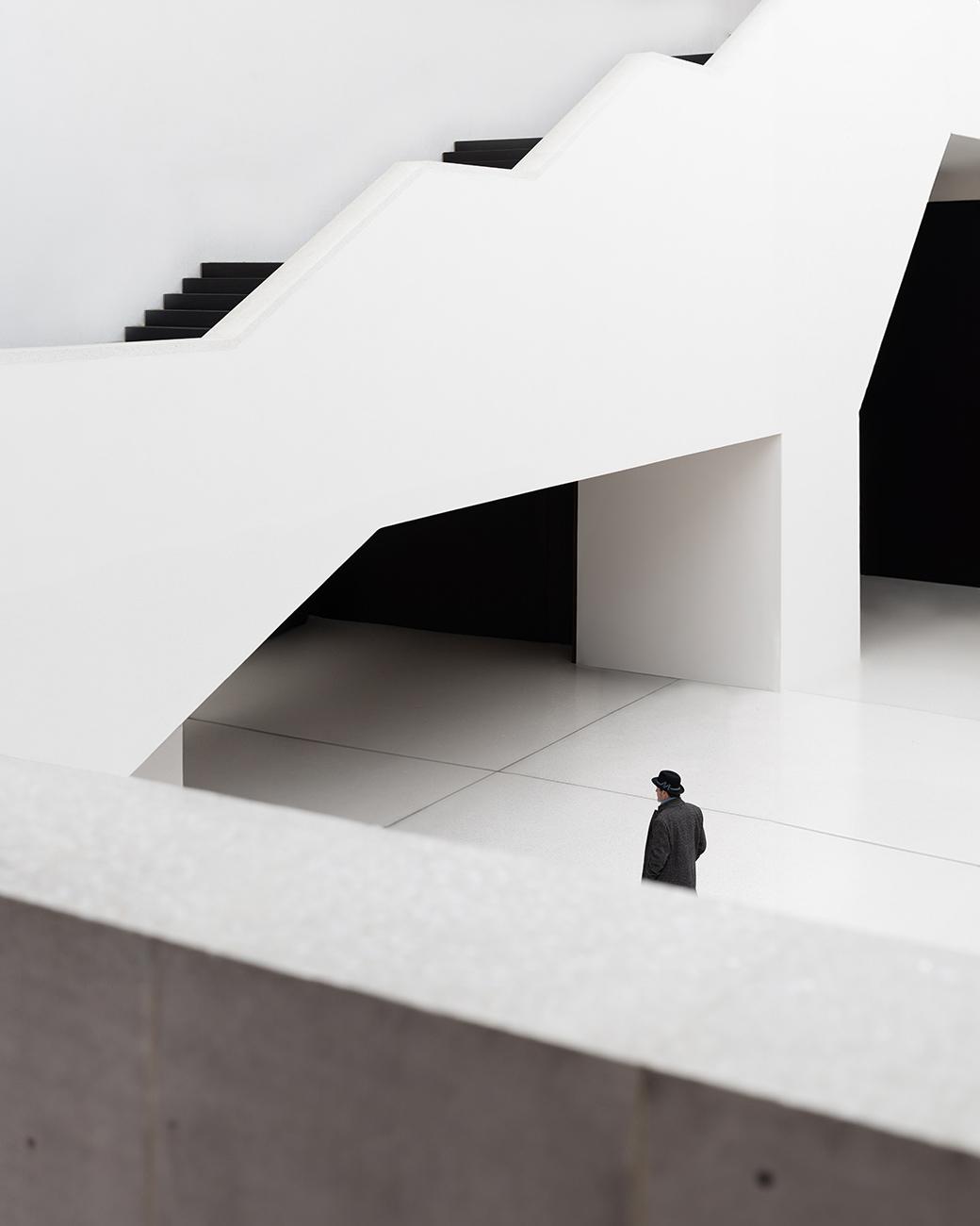 Der Mensch tritt nur als kleine, flüchtige Figur in Erscheinung. Seine Bewegung steht im Kontrast zur stillen Präsenz der gebauten Struktur. Dadurch entsteht ein Spannungsfeld zwischen Maßstab, Bewegung und Stille.